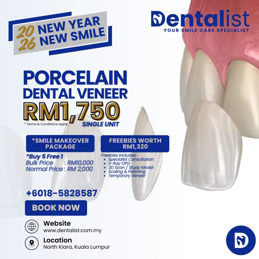 在吉隆坡登特利斯特庆祝我们的新年新笑容瓷贴面促销,单个单位13%减免和买5送1(17%减免)并在登特利斯特提供免费咨询!优惠有效至2025年12月31日。您的微笑护理专家。